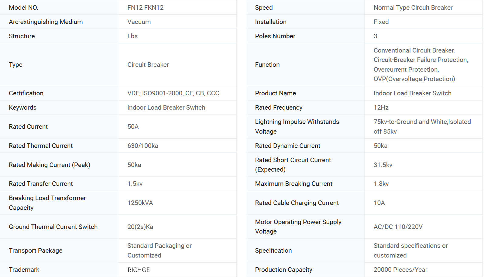 FKN12-12R.D/100-31.5 tip notranja AC visokonapetostna obremenitvena kombinacija stikala in varovalke je notranja visokonapetostna stikalna naprava, ki združuje obremenitveno stikalo FKN12-12D in visokonapetostno tokovno omejevalno varovalko XRNT port-12. Zanesljivo lahko prekine kateri koli tok do toka kratkega stika: stikalo bremena prekine delovni tok, varovalka prekine tok kratkega stika in skupaj prekine kakršen koli prevelik tok med delovnim tokom in polnim tokom kratkega stika, varovalka pa povzroči, da je stikalo bremena odprto.