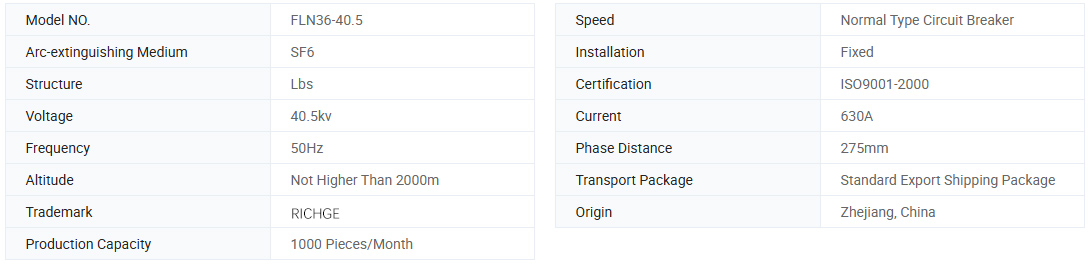 FLN36-40.5D/T630 Indoorni žveplov heksurid (SF6) Stikalo za obremenitev in FLN36-40.5DR/125 kombinacija obremenitvenih varovalk sta primerna za napajalne postaje in industrijsko električno opremo s trifaznim omrežnim napajanjem AC 50/60Hz. Uporabljajo se kot zaščita ob krmilni liniji obremenitve za električne sisteme. Stikalo obremenitve deli in zapre tok obremenitve, tok zaprte zanke, transformator brez obremenitve in kabelski polnilni tok; Kombinirane električne naprave lahko razbijejo kateri koli tok pod nazivnim tokom kratkega stika in so primerne za električne popolne sklope opreme, kot so glavne enote obročev in podstanice.