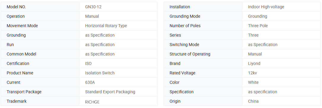 Notranji rotacijski visokonapetostni ločilnik GN30-12 je nov tip z rotacijskim nožem. Glavna strukturna formula je pritrditev dveh nizov izolatorjev in kontaktov na zgornjo in spodnjo ravnino trifaznega skupnega nizkega okvirja, pri čemer se izvede odpiranje in zapiranje stikala z vrtenjem noža. Stikalo GN3-12D dodaja obliko povezovalnega noža na osnovi GN30-12 za potrebe različnih energetskih sistemov. Ta izdelek je kompaktne oblike, majhnega prostora, močne izolacije, enostaven za namestitev in prilagajanje. Izpolnjuje zahteve za "AC visokonapetostno ločilno stikalo in ozemljitveno stikalo" in se uporablja za notranje sisteme z nazivno napetostjo do 10 KV AC 50 Hz in manj. Lahko se uporablja kot odpiralni in zapiralni tokokrog, ko je napetost in ni obremenitve. Lahko se uporablja z visokonapetostnimi stikalnimi napravami ali pa se lahko uporablja samostojno.