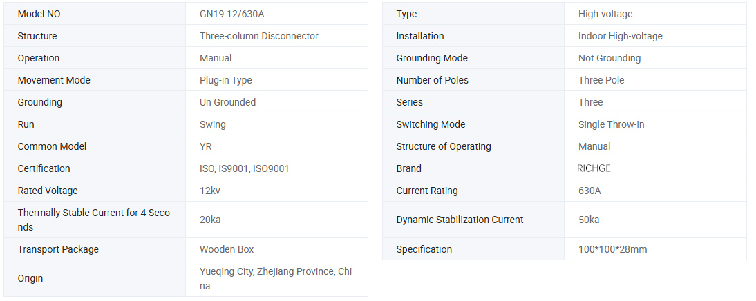 Notranje visokonapetostno izolacijsko stikalo AC serije GN19-12(c) je primerno za AC 50hz, nazivno delovno napetost 12kv, 10kv, nazivni delovni tok 400A, 630A, 1250A napajalni sistem, kot napetost in brez obremenitve pod pogojem zloma, notranja stikalna naprava zaprtega kroga. Nazivna napetost 12kv in pod napajalnim sistemom, opremljen z mehanizmom za ročno upravljanje, ki se uporablja za preklapljanje električnih naprav pod pogojem napetosti, vendar brez obremenitve, so odposlani tudi za proizvodnjo naprav proti obraščanju, tipa platoja in naprav za prikaz v živo, ki jih je mogoče namestiti. Notranje visokonapetostno ločilno stikalo serije GN19-12 je notranja naprava z nazivno napetostjo 12 kv in trifaznim izmeničnim tokom 50 Hz.